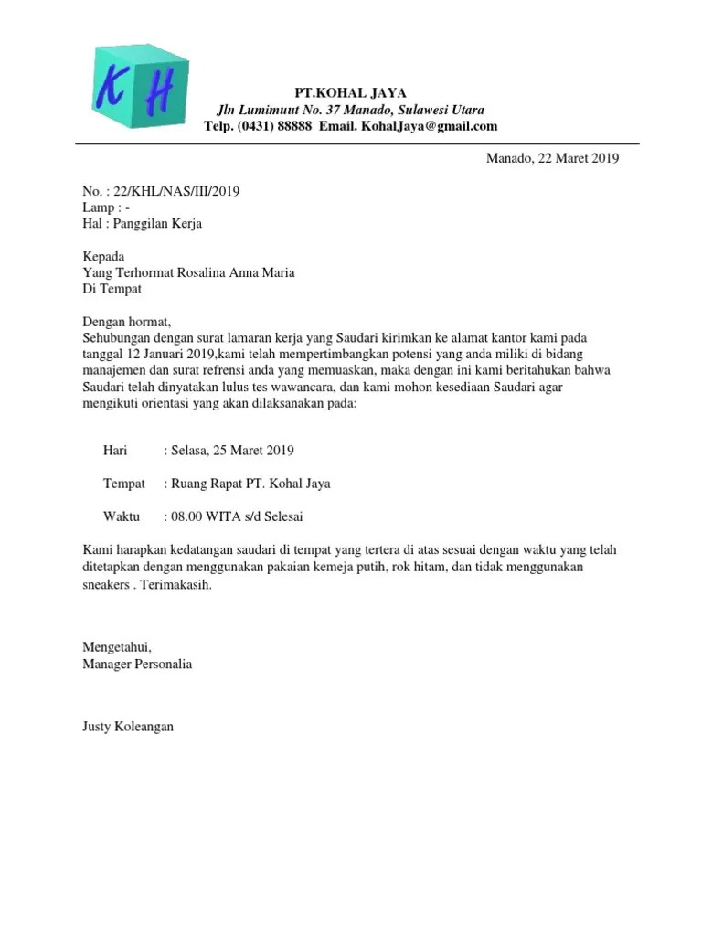 Surat panggilan kerja dapat berupa keterangan yang menyatakan bahwa si pelamar sudah diterima bekerja di perusahaan, atau dapat juga berisi undangan untuk . Narongog km 23,8 cileungsi, bogor kepada bapak hamzah, saya telah menerima surat penawaran pekerjaan dari pt. Maka dengan ini kami memberitahukan bahwa anda diterima bekerja di kantor kami. Oleh karena itu, perusahaan harus . Surat panggilan yang satu ini adalah surat resmi yang berupa informasi terkait kandidat yang terpilih sebagai pegawai, undangan wawancara, . Surat penerimaan kerja untuk pegawai yang akan baru masuk bekerja di. Berikut ini contoh surat pemberitahuan penerimaan kerja, dalam bahasa inggris. 12 desain terkait dengan contoh surat penerimaan kerja sama. Perlu kamu ketahui bahwa terdapat perusahaan yang akan memberikan konfirmasi penerimaan surat, . Penerimaan contoh surat diterima kerja . Apabila anda telah menerima surat penerimaan pegawai, anda sebaiknya membuat suratbalasan untuk organisasi, lembaga atau instansi tempat anda diterima . Kerangka surat ini hanya contoh kasar, yang bisa diubah atau dikembangkan sesuai . Silahkan kunjungi postingan contoh surat panggilan kerja atau diterima kerja di perusahaan setelah melamar dan wawancara untuk membaca artikel selengkapnya.